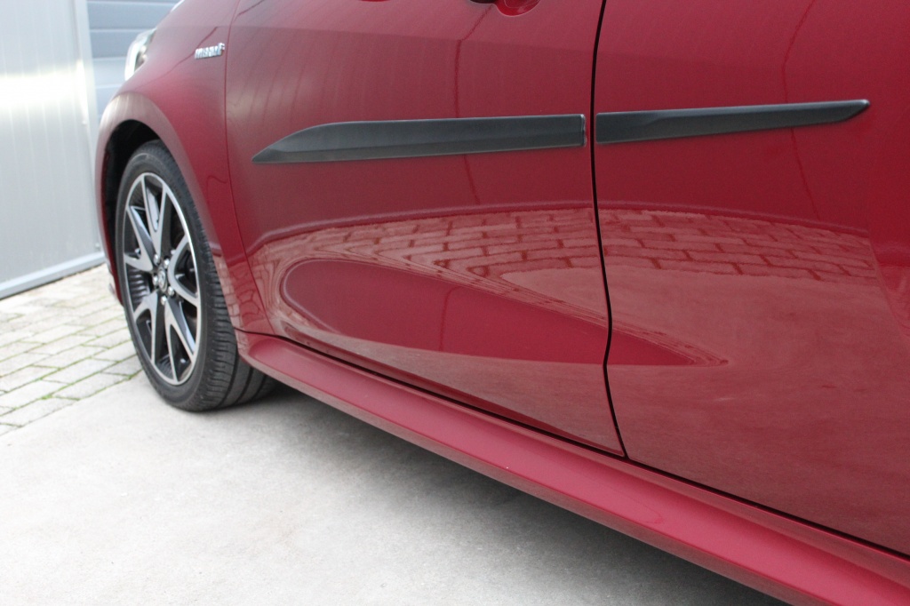 De looks van deze Luxe,, Bi-Tone uitvoering zijn helemaal fantastisch met de mica donker rode lak en zwart dak met zwarte lichtmetalen 17”velgen, privacyglass en achterspoiler.